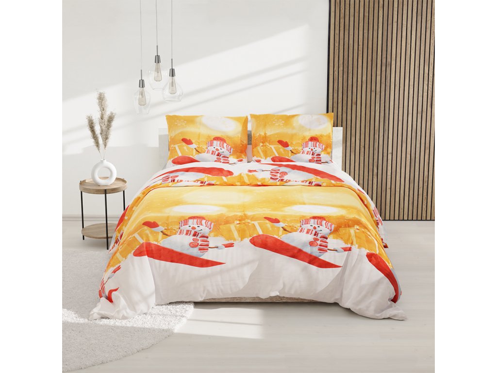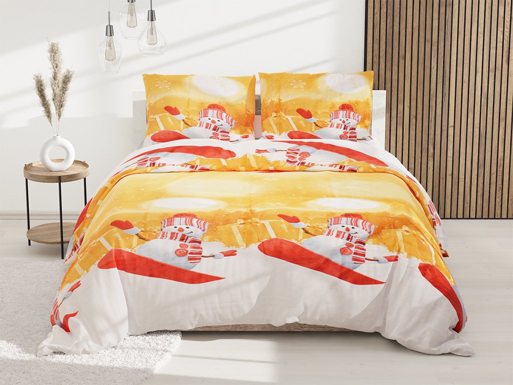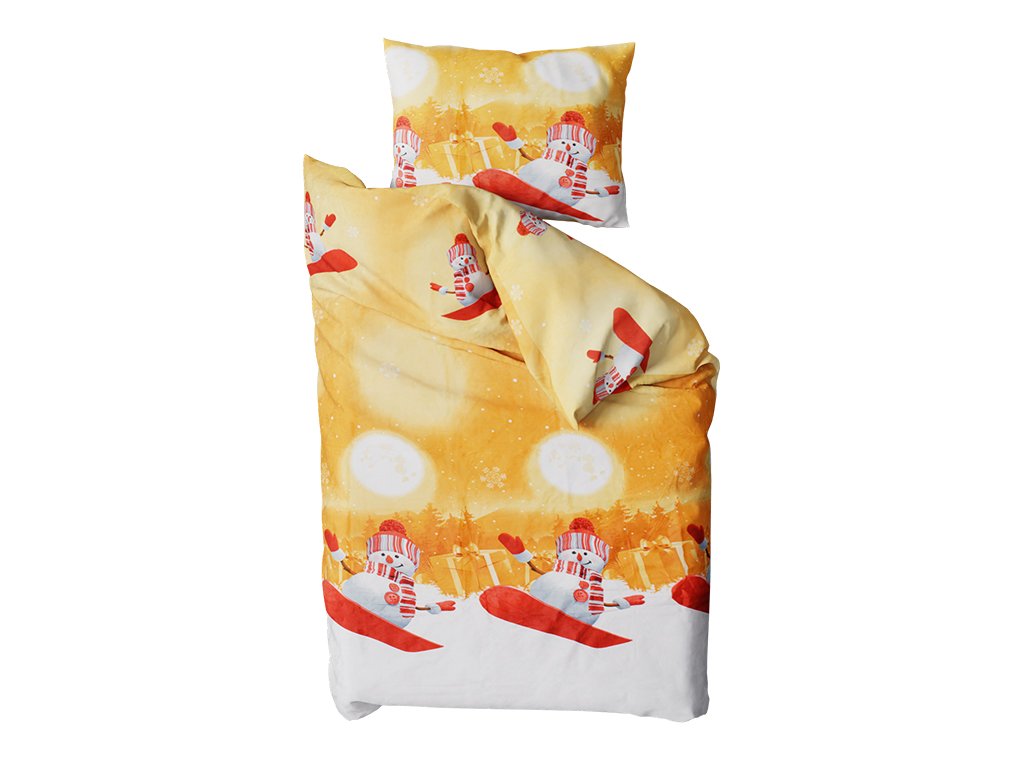 Bavlněné povlečení SNĚHULÁK NA SNOWBOARDU žluté + povlak na polštářek 40 x 50 cm zdarma