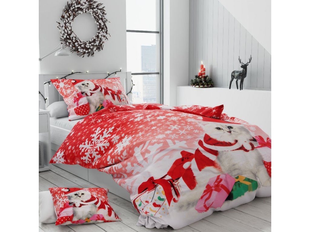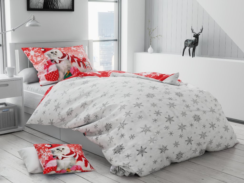Bavlněné povlečení Vánoční kočička + povlak na polštářek 40x50 cm zdarma
