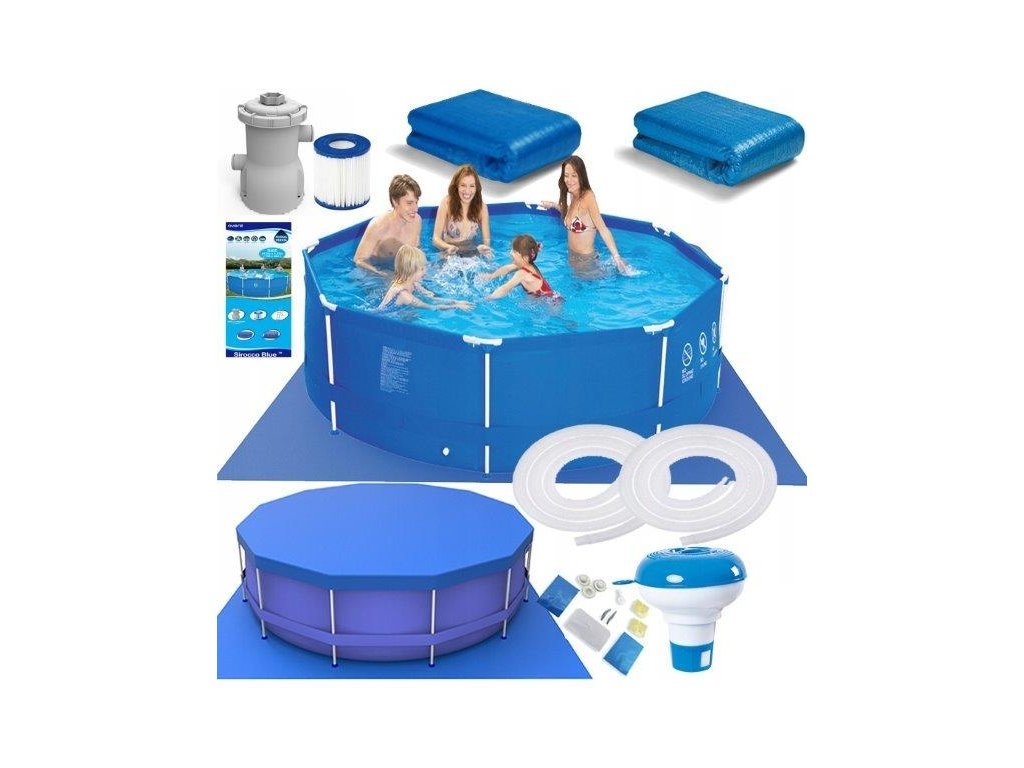 - Zahradní bazén, kovový rám bazénu, rackové konektory, výkonné čerpadlo 1136 l/h, filtr pro čerpadlo, hadice pro připojení čerpadla, hadicové svorky, filtry pro kontaminanty, vypouštěcí ventil, koncovky otvorů čerpadla, těsnění, zastřešení bazénu, podložka k bazénu, plovákový dávkovač chemie, brožura POOL ABC + pokyny na sestavení