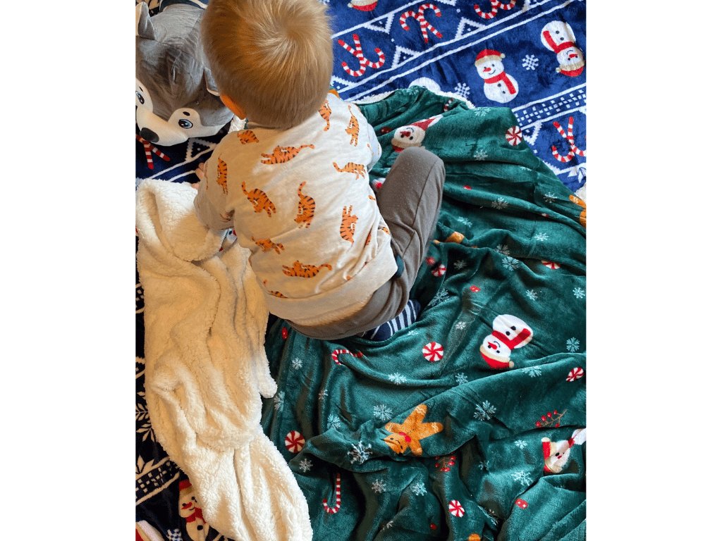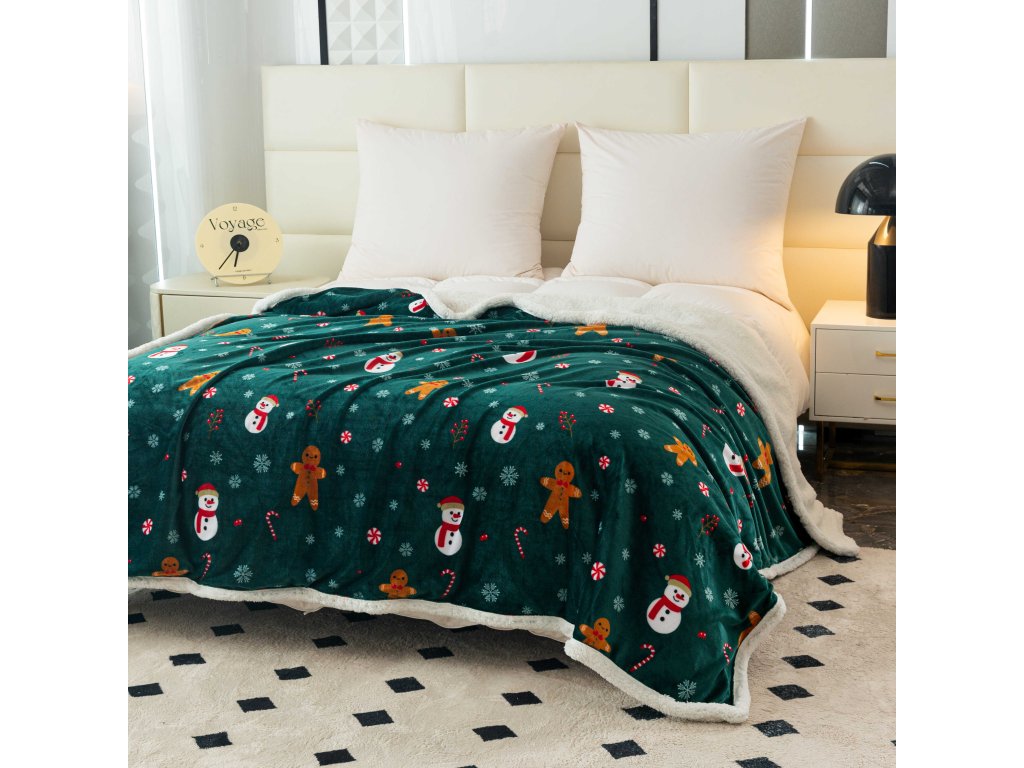 Vánoční tmavě zelená beránková deka z mikroplyše SNĚHULÁK A PERNÍČEK