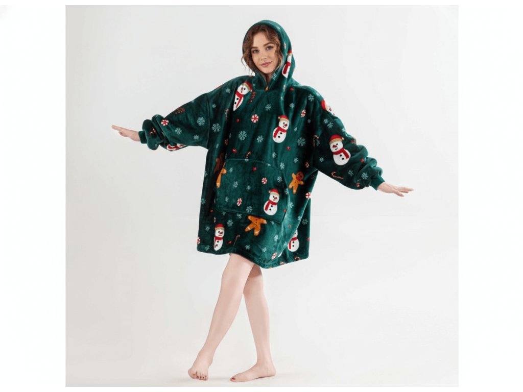 Beránková mikinová deka s rukávy a kapucí SNĚHULÁK A PERNÍČEK zelená