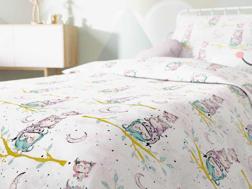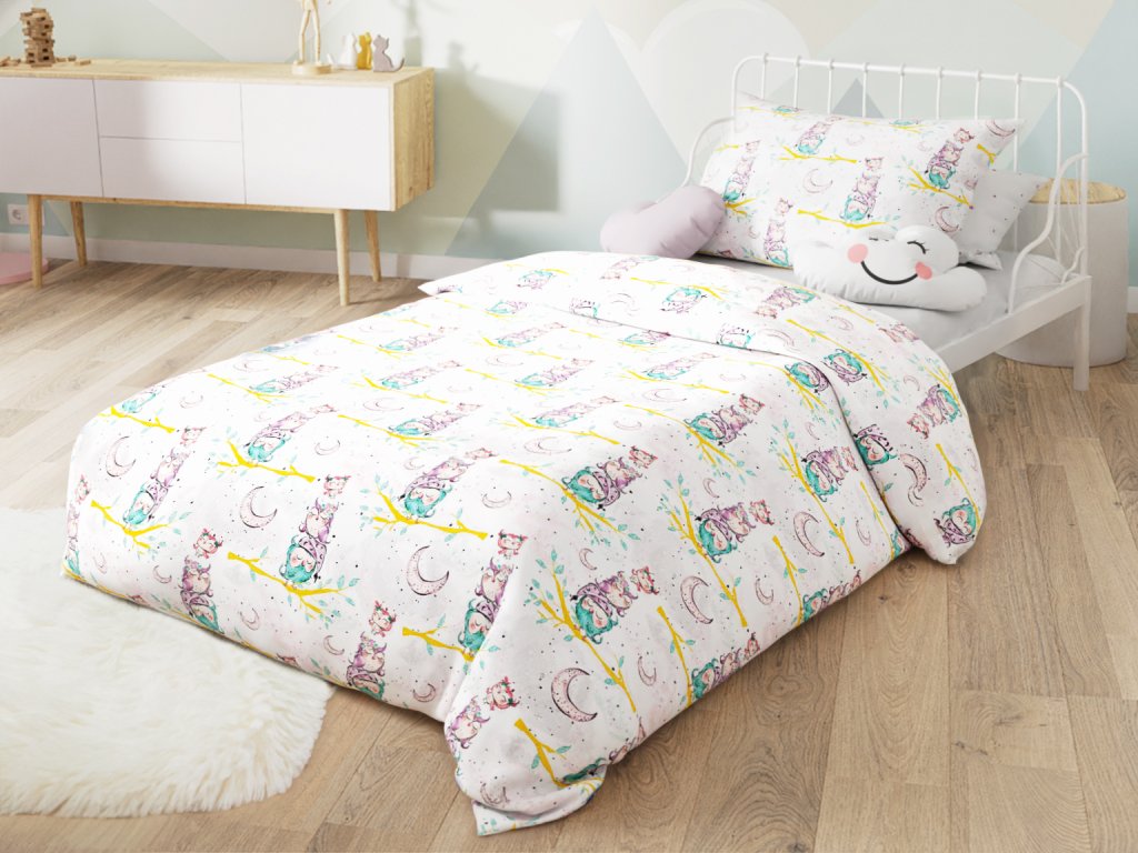 Bavlněné povlečení do postýlky SPÍCÍ SOVIČKY bílé
