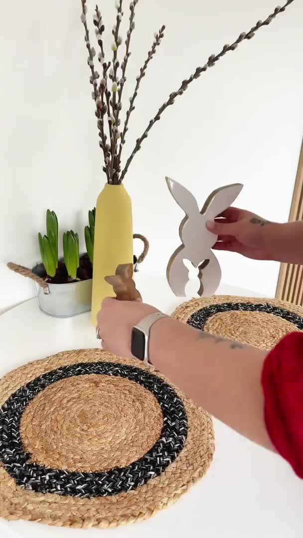 Tato sada dřevěných velikonočních dekorací přináší do vašeho domova jedinečný dotek přírodního stylu. Minimalistický design z mangového dřeva je ideální nejen pro sváteční období, ale i jako stylový doplněk do moderního interiéru. Dvě do sebe zapadající figurky králíčků skvěle vyniknou na poličce, konferenčním stolku nebo v sezonním aranžmá. Vytvořte si útulnou atmosféru, která bude oslavovat kouzlo jarních dní.