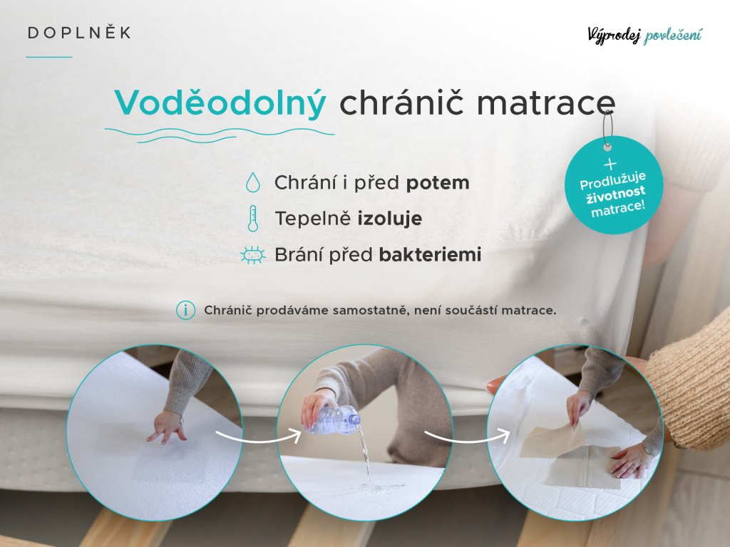 Prodlužte vaší matraci životnost, zamezte možnému znečištění a spěte klidně v čistých hygienických podmínkách. Ideálním řešením je použití chrániče matrace, který je vodoodpudivý, chrání tedy i před nadměrným pocením. Zdravý dospělý člověk vypotí během noci až půl litru tekutin. Vhodný je tedy nejen pro děti, ale také pro dospělé. Dalšími kladnými důvody pro používání chrániče je zajisté tepelná izolace, ochrana před bakteriemi a roztoči, navíc je prodyšný a snadno se udržuje.