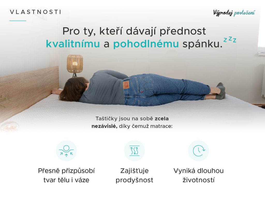 Taštičkové matrace patří k nejžádanějším matracím vůbec, díky dokonalé technologii přináší nový pohled na pružinové matrace. Propracované uložení pružin jsou hlavním elementem stability celé konstrukce. Každá pružinka je pečlivě uschována ve své vlastní taštičce. Pružiny jsou tak nezávislé na dalších, pracuje každá zvlášť. Pokud stlačujete jednu pružinu, nehýbe se žádná další. Díky tomu se matrace tvaruje přesně podle vašeho těla a dopřeje vám ničím nerušený, komfortní spánek.