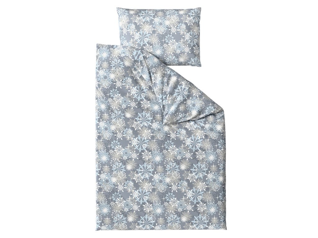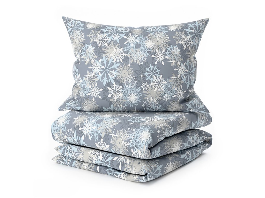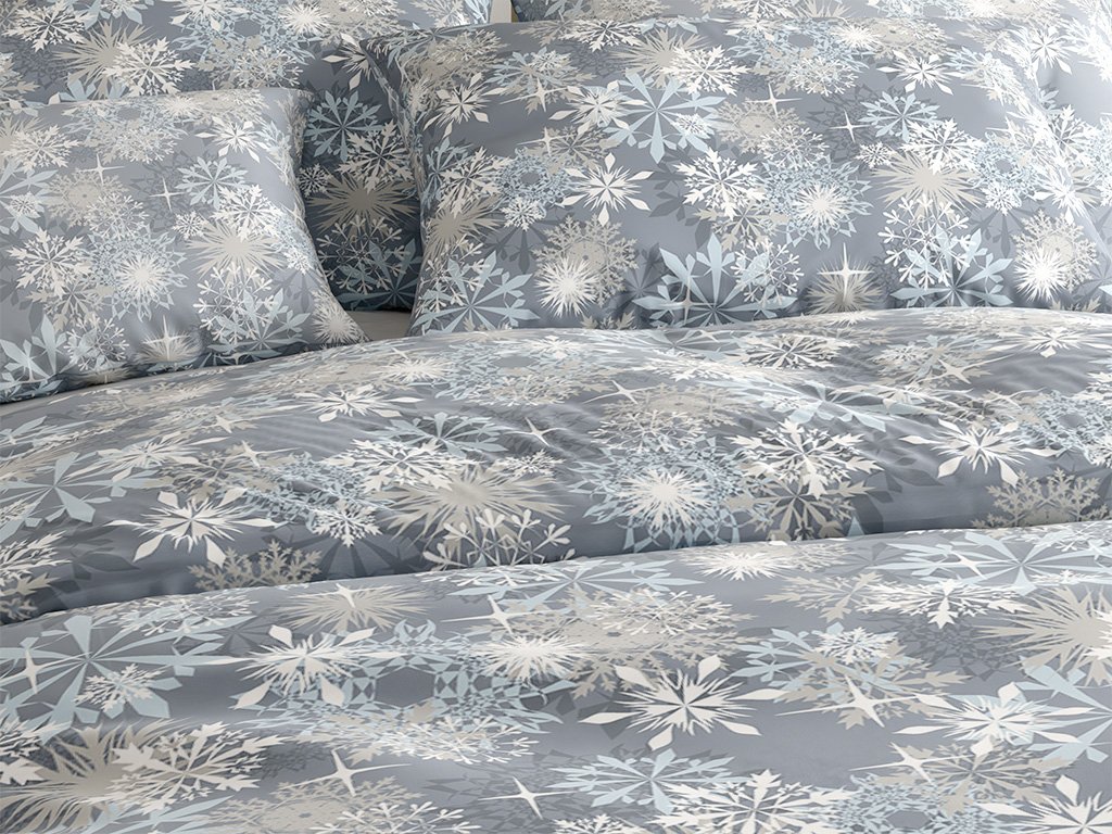 Tmavý modrošedý podklad se sněhovými vločkami se skvěle kombinuje s prostěradly v bílé, světle šedé či béžové barvě. Povlečení zapadne do moderní i klasické ložnice a během zimních měsíců vytvoří útulnou atmosféru plnou klidu a harmonie.