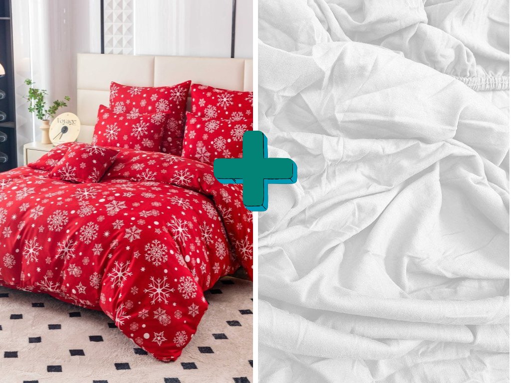 Sada bavlněného povlečení SNOWFALL červené + JERSEY prostěradlo EXCLUSIVE 90x200 cm bílé, jednolůžko
