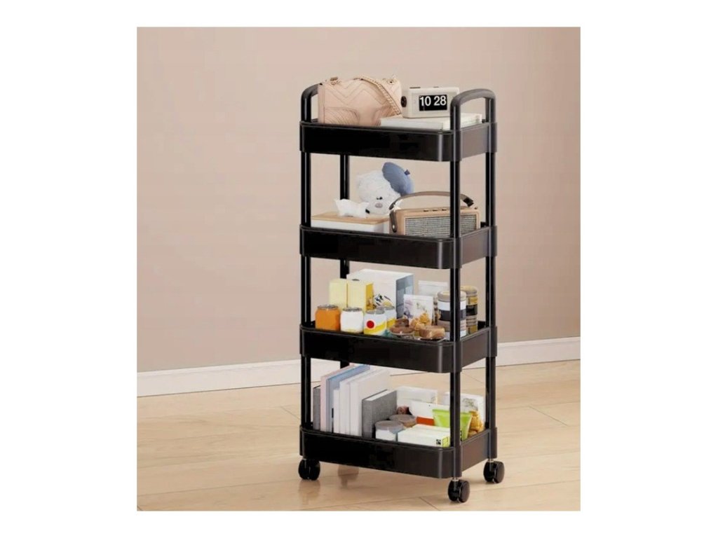 Praktický regál na kolečkách POZIO o rozměrech 37x22x95 cm v černé barvě je ideálním řešením pro organizaci vaší domácnosti. 4 prostorné police poskytují dostatek místa pro uložení potravin, kuchyňských potřeb nebo drobných dekorací.