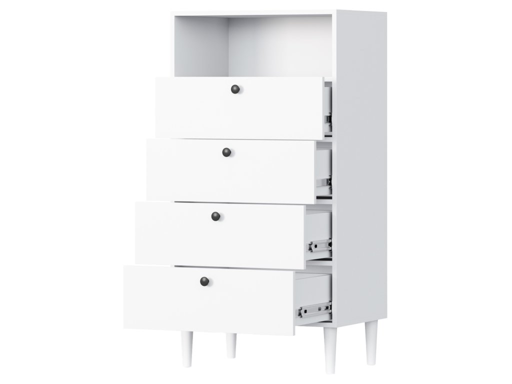 Tato komoda je ideálním řešením pro každého, kdo hledá funkční a estetický prvek do menších prostor. Její moderní design v kombinaci s praktickými zásuvkami a otevřenou policí poskytuje dostatek místa pro uložení vašich věcí, a přitom nezabere příliš prostoru. Díky univerzální bílé barvě se snadno sladí s ostatním nábytkem, zatímco výška nožiček umožňuje snadnou údržbu podlahy. Komoda je skvělou volbou do předsíně, ložnice nebo pracovny, kde nabídne elegantní způsob, jak udržet pořádek.