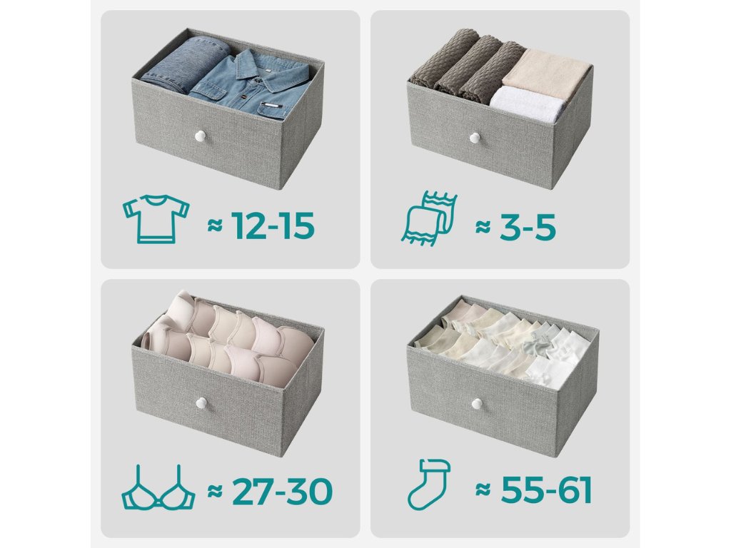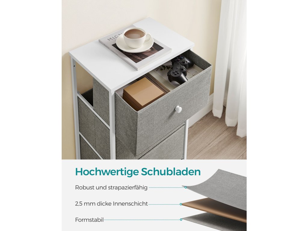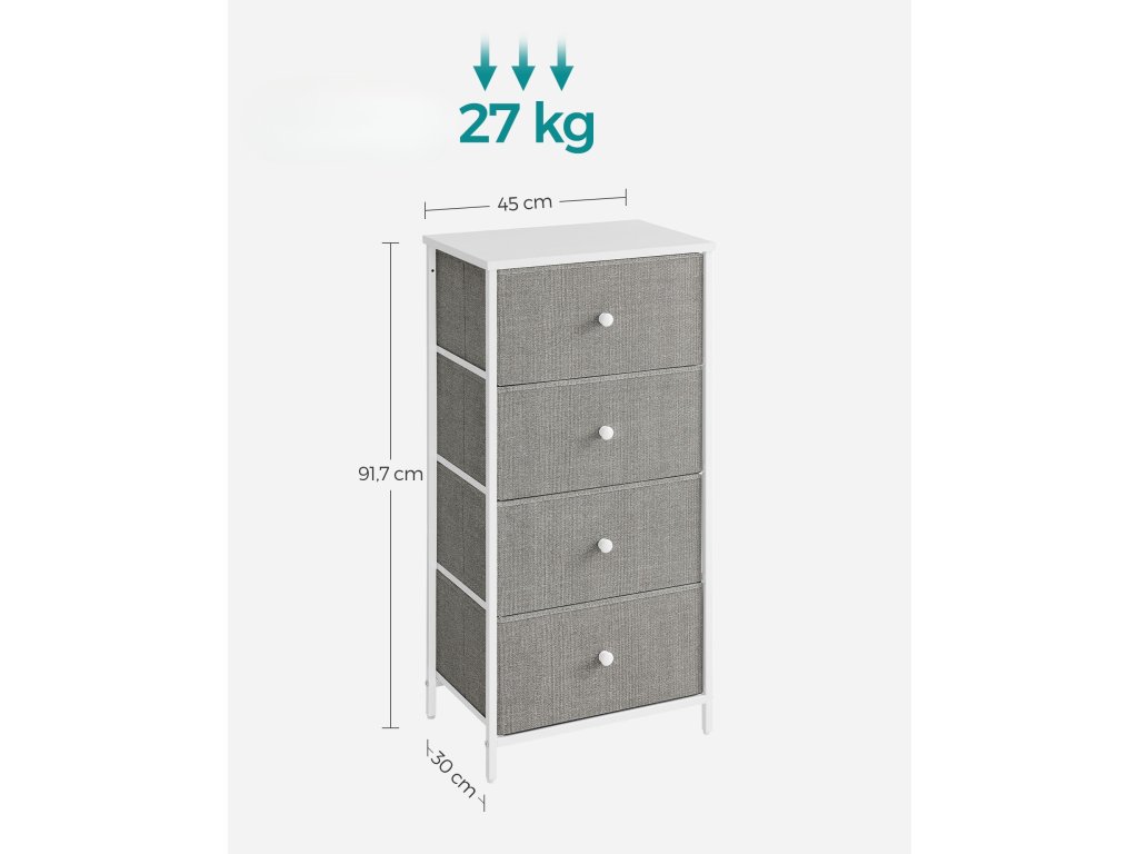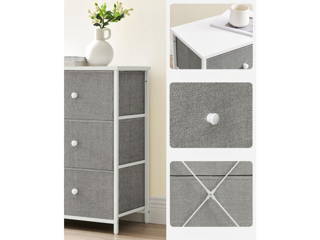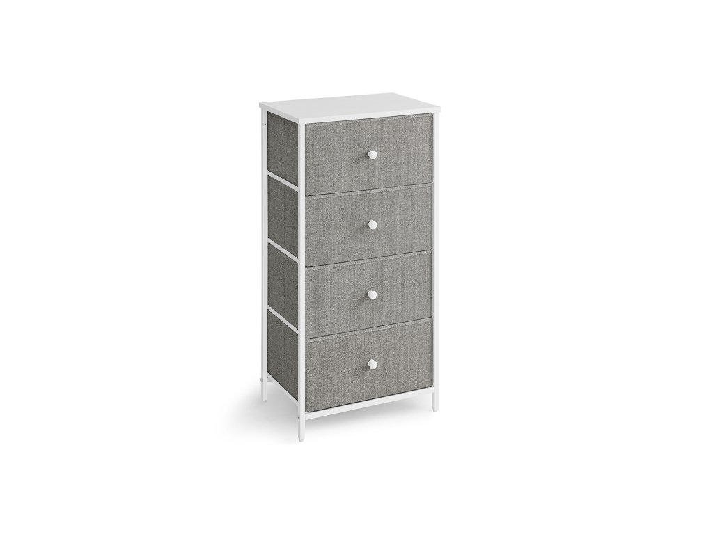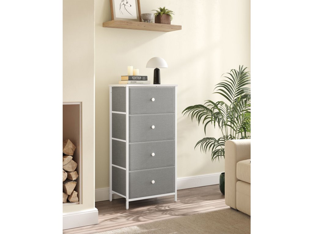 Tato stylová komoda v kombinaci šedé textilie a bílé konstrukce je ideálním řešením pro každodenní organizaci. Ať už ji postavíte do ložnice na spodní prádlo, do předsíně na doplňky nebo do dětského pokoje na hračky, vždy nabídne dostatek prostoru díky 4 prostorným zásuvkám. Díky své lehké konstrukci se snadno přesouvá, a přesto zůstává stabilní díky výztuhám a možnosti přichycení ke zdi. Elegantní vzhled a praktické využití z ní dělají ideální volbu pro každý domov.
