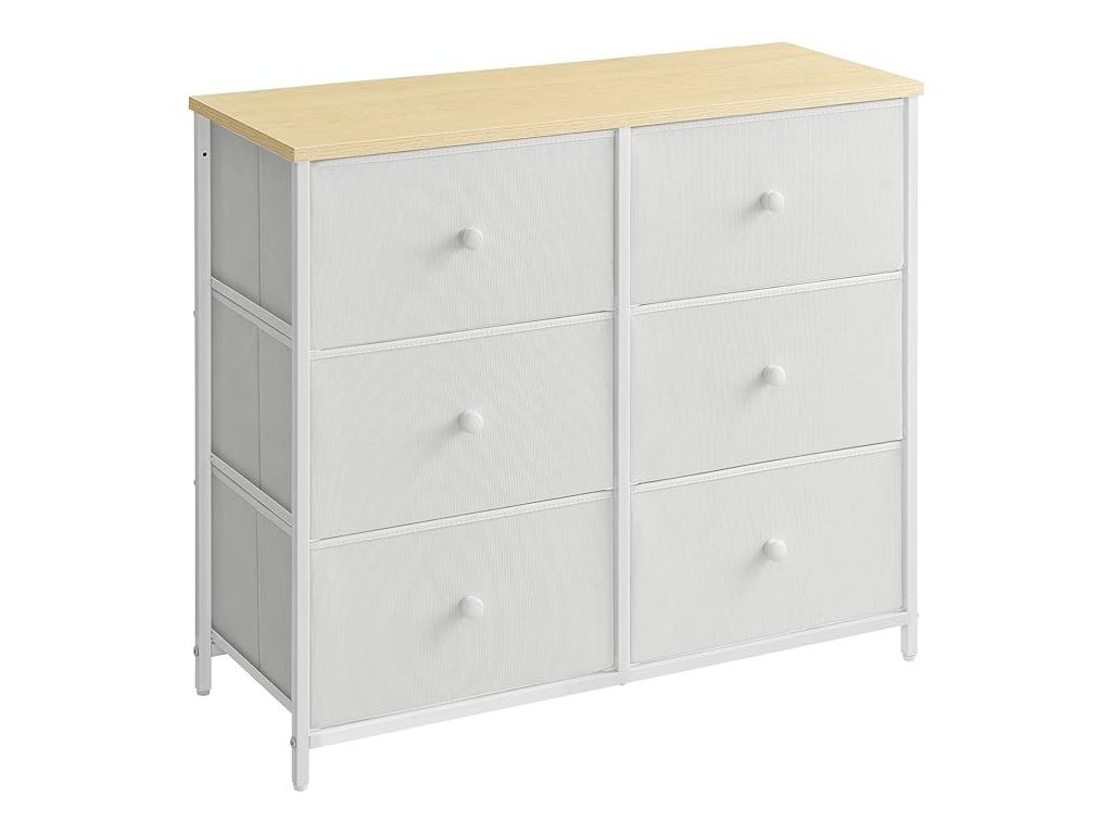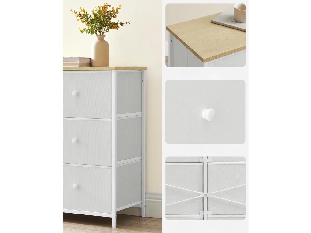 Tato stylová komoda v kombinaci bílé textilie a přírodního dekoru dubu je ideálním řešením pro každodenní organizaci. Ať už ji postavíte do ložnice na spodní prádlo, do předsíně na doplňky nebo do dětského pokoje na hračky, vždy nabídne dostatek prostoru díky 6 prostorným zásuvkám. Díky své lehké konstrukci se snadno přesouvá, a přesto zůstává stabilní díky výztuhám a možnosti přichycení ke zdi. Elegantní vzhled a praktické využití z ní dělají ideální volbu pro každý domov.