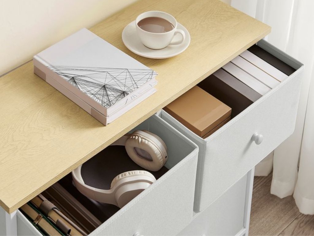 - 6 vyjímatelných textilních zásuvek s látkovým potahem