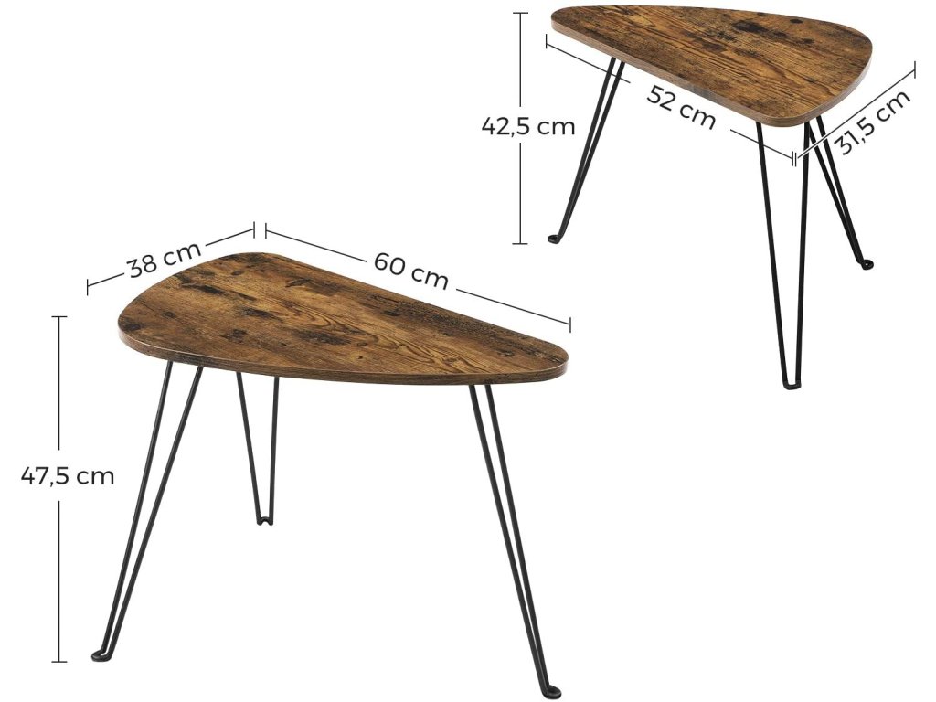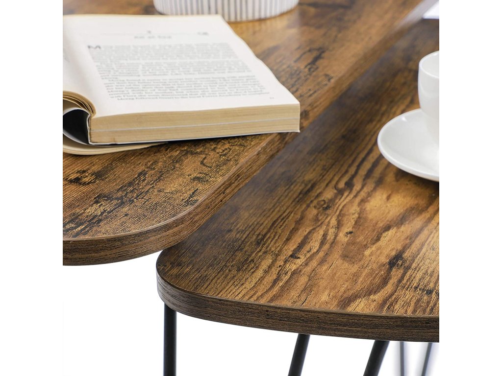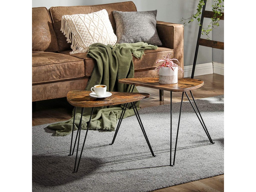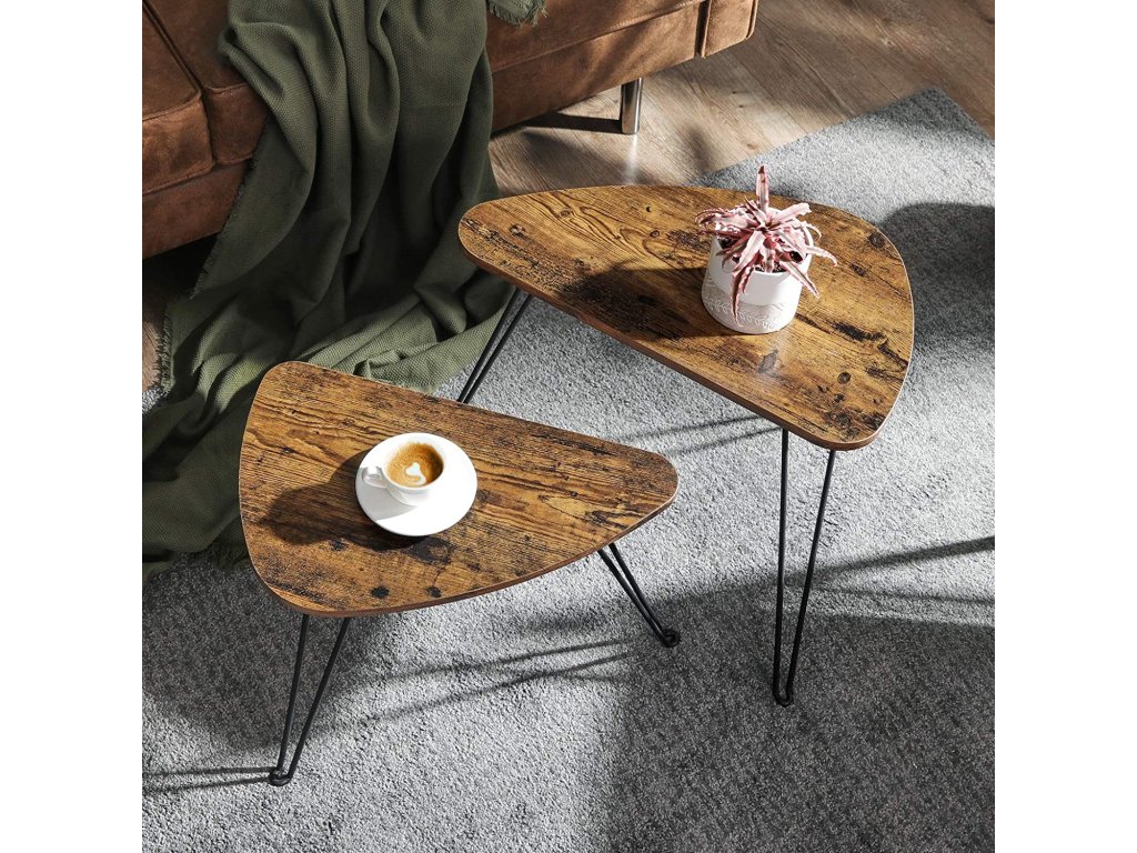 Sada dvou stolků v rustikálním designu přináší do vašeho domova praktičnost i eleganci. Jejich organické tvary působí jemně a přirozeně, zatímco kombinace dřeva a kovu vytváří stylový kontrast vhodný do moderních i klasických prostor. Díky rozdílné velikosti je lze zasunout pod sebe nebo použít samostatně, například jako servírovací stolek pro návštěvy či dekorativní prvek s květinou nebo svíčkou. Všestranné využití a poutavý vzhled z nich činí ideální doplněk pro každý obývací pokoj.