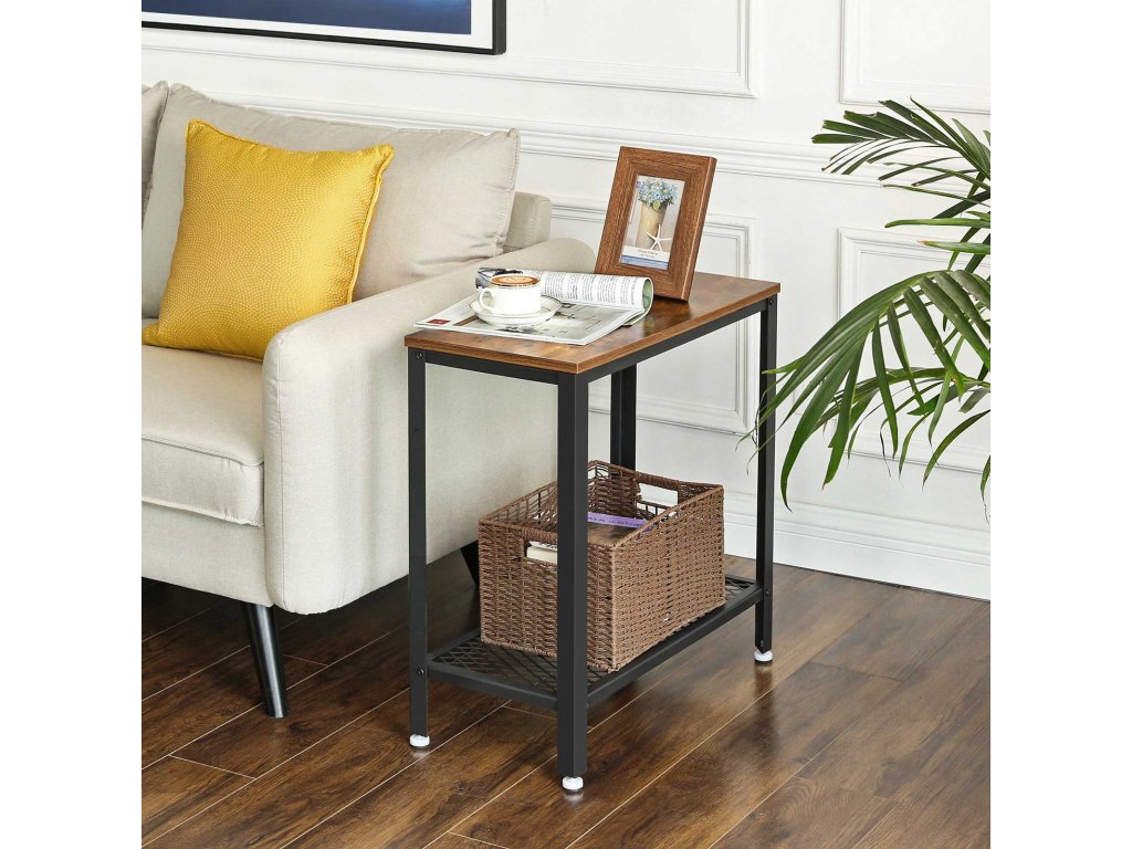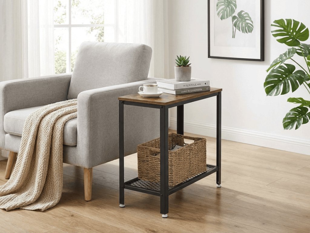 Díky svému kompaktnímu tvaru a praktickému provedení se tento stolek stane vaším nepostradatelným spojencem v každé místnosti. Nabízí ideální prostor pro odložení knihy, šálku kávy nebo dekorací, zatímco spodní kovové police poslouží k přehlednému uskladnění časopisů, košíků nebo elektroniky. Kombinace dřeva a kovu dodává interiéru industriální nádech a zároveň se snadno sladí s různými styly zařízení. Využijte stolek vedle pohovky, v předsíni nebo jako noční stolek – možností je spousta.