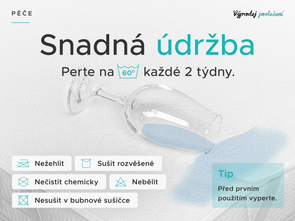 Údržba matracových chráničů je opravdu snadná. Před prvním použitím chránič vyperte a důkladně vysušte. Pro zachování požadovaných vlastností, především nepropustnosti, doporučujeme prát při maximální teplotě 60 °C. Při pravidelné výměně ložního prádla perte i chránič, ideálně 1x za 14 dní. Po usušení nechce chránič volně vysušit, nedoporučujeme používat bubnovou sušičku. V žádném případě ho nevyvářejte, nebělte a nepoužívejte jiné chemické přípravky. Horní vrstvu z mikrovlákna není nutné žehlit. Po vyprání a vysušení je opět dokonale hygienicky čistý a připravený k použití.