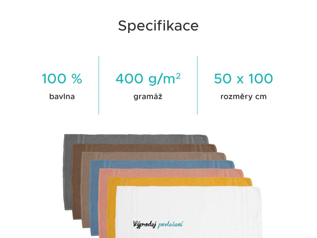 Klasické ručníky o gramáži 400 g/m2 jsou vyrobené z kvalitní bavlny a velice oblíbené u široké populace. Střední gramáž ručníků zajistí všechny požadované vlastnosti v dobré kvalitě. Nižší gramáž se projevuje zejména na síle materiálu, ten je o něco tenčí, ale stále pevný.