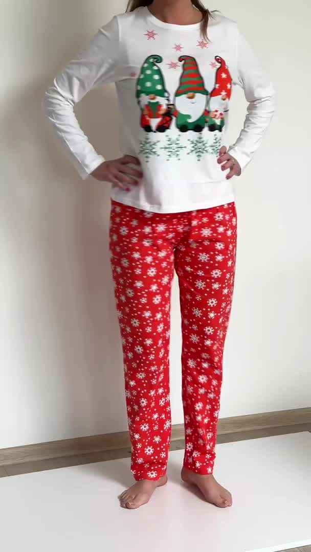 Horní díl pyžama zdobí roztomilý potisk s vánočními skřítky, zatímco červené kalhoty s motivem sněhových vloček krásně doplňují celý vzhled. Díky přírodním materiálům je pyžamo prodyšné a příjemné k pokožce, což zaručuje klidný a pohodlný spánek.