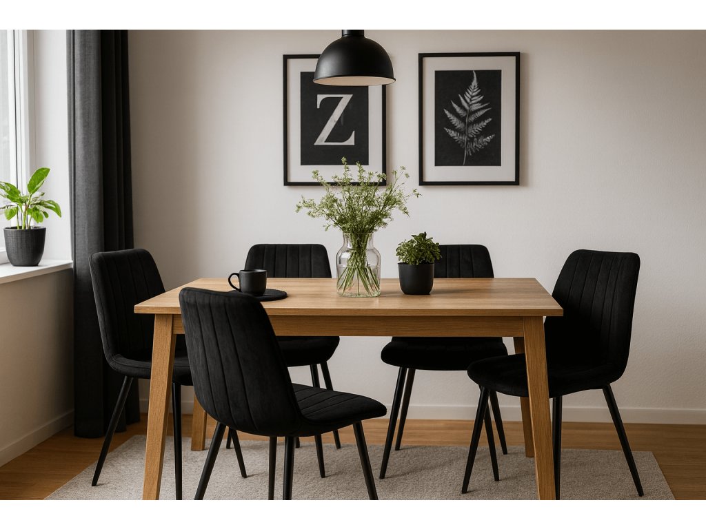 Styl spojující jednoduché tvary a vysokou funkčnost. Vsaďte na střídmé doplňky, jemnou paletu barev a přírodní materiály. Skvělými doplňky do skandinávské jídelny jsou stálezelené rostliny, barevné prostírání a velké kovové lampy. Skandinávský interiér se neobejde bez velkých oken a osvětlení, které zaručí světlo i během krátkých dnů. Čalouněná jídelní židle Lava dokonale zapadne do jídelny inspirované skandinávskými zeměmi. Jednoduché prošívání a černé nohy slaďte se stolem s kovovými elementy. Výborně vypadají různé barvy židlí u jednoho stolu. Nebojte se změny.
