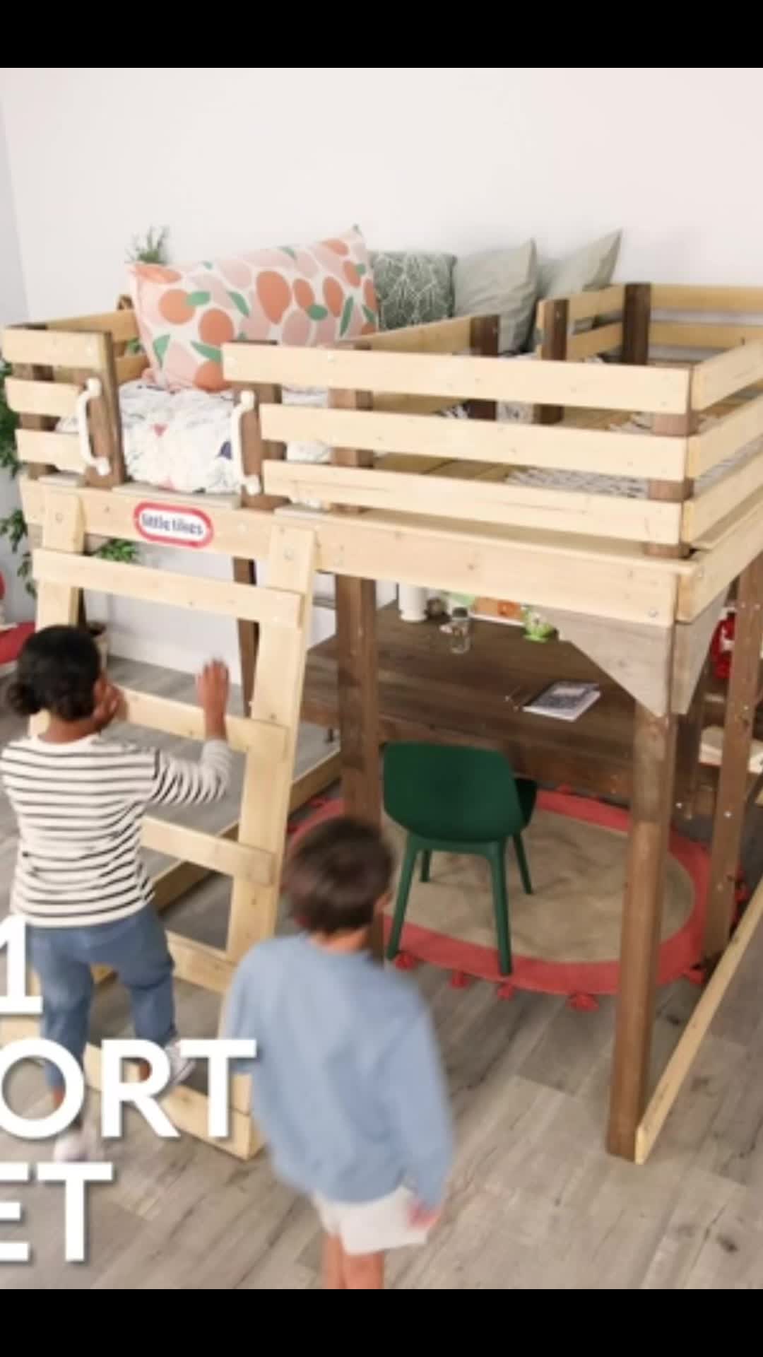 - S úložnými policemi, žebříkem, psacím stolem a houpací sítí