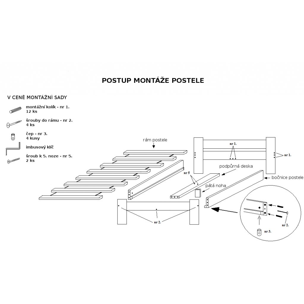 K montáži postele obdržíte potřebný materiál, sestavení bude tedy o něco snadnější. Jednotlivé díly postele jsou balené v kartonech, součástí balení jsou také šrouby, klíč pro montáž a příslušenství, samozřejmostí je také návod k použití postele a sestavení.