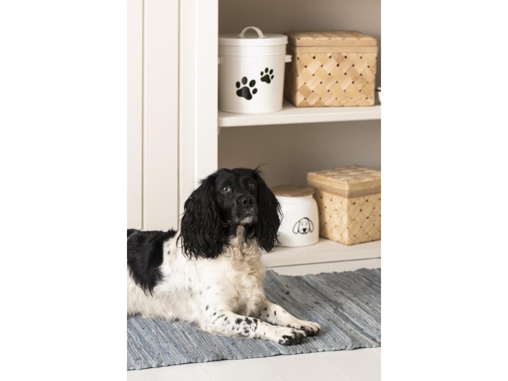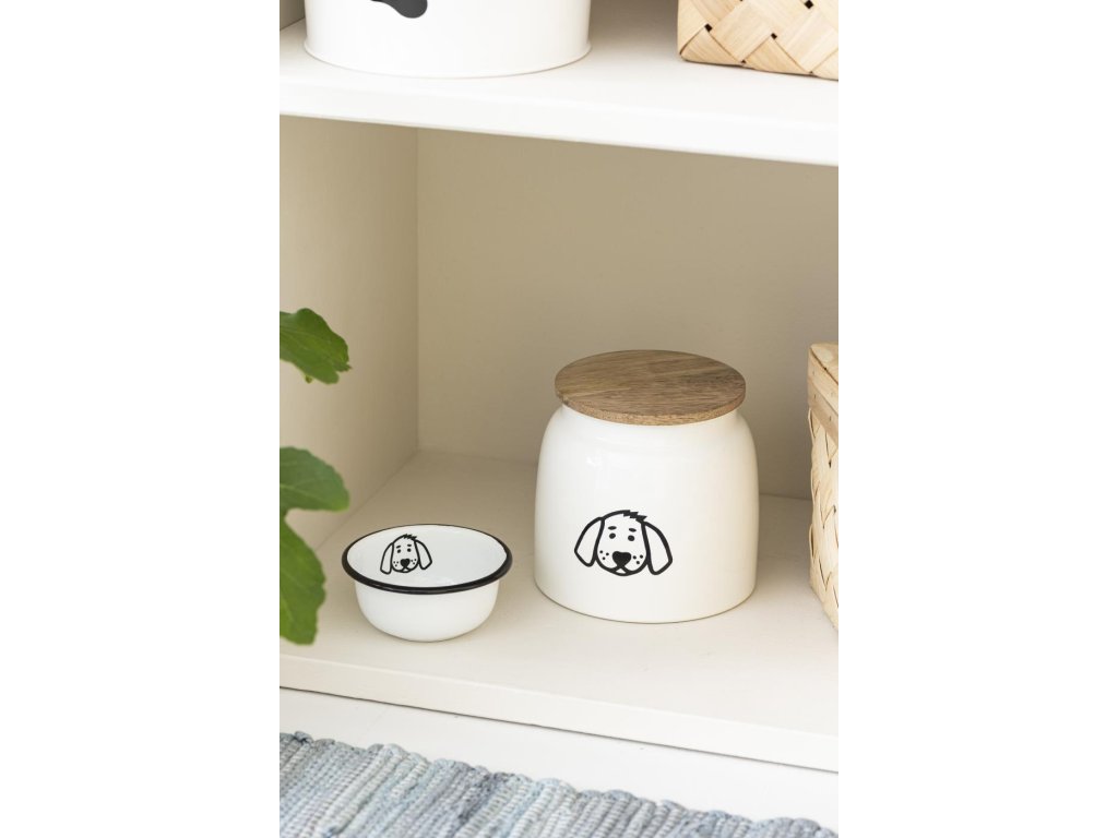 Bílá kovová dóza na krmivo pro psy s dřevěným víkem DOG FOOD