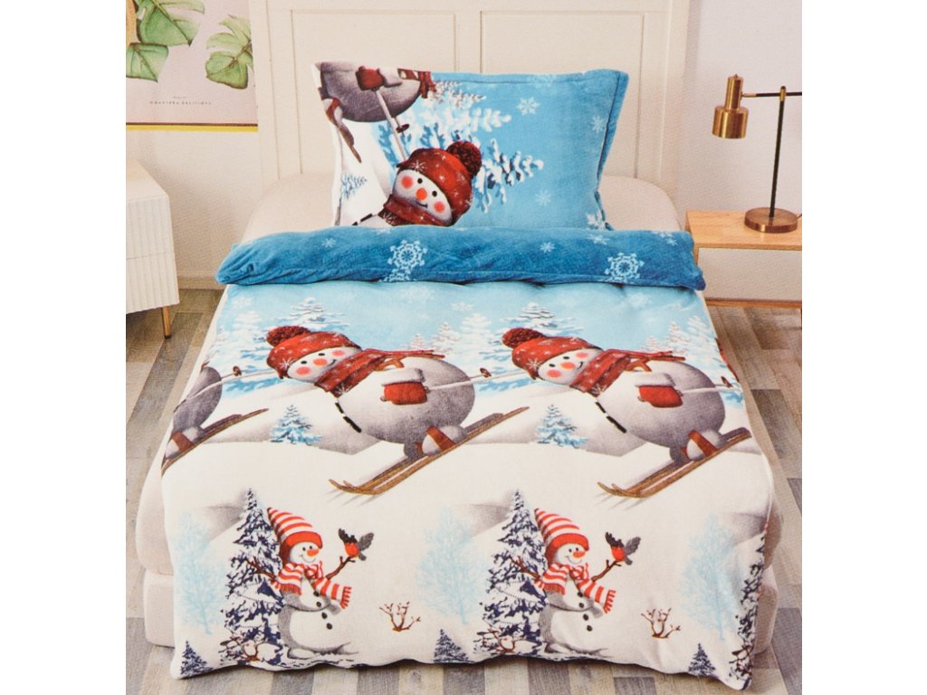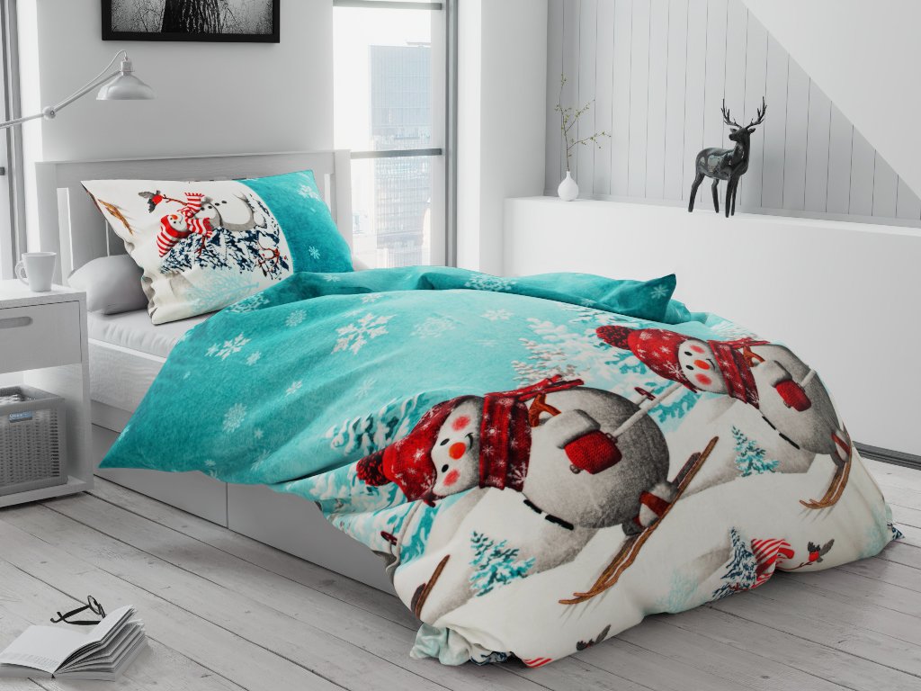Mikroplyšové povlečení SNĚHULÁK NA LYŽÍCH světle modré