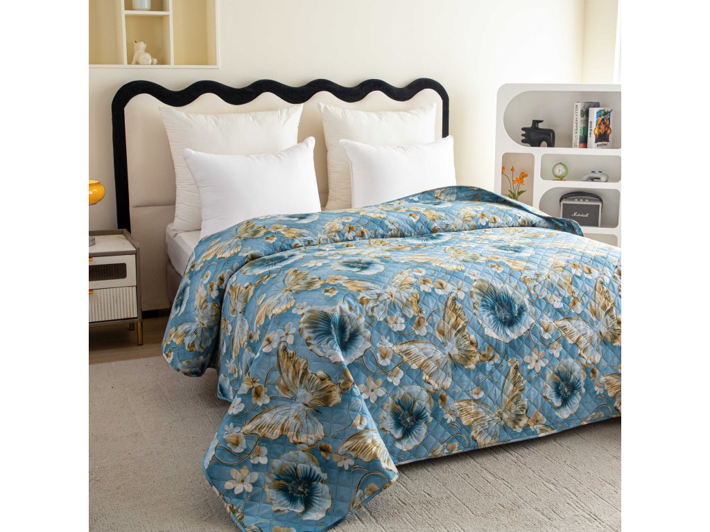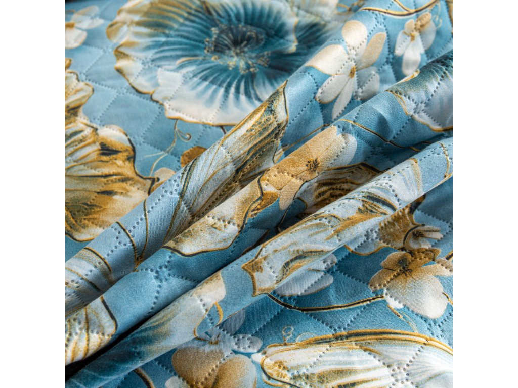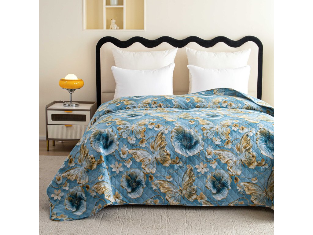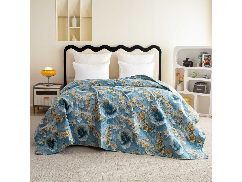 Dopřejte si kouzlo elegance s přehozem CELESTIA v jemné modré barvě. Romantický vzor květin a motýlů v zlatavých tónech dodá vaší ložnici nádech luxusu a klidu.