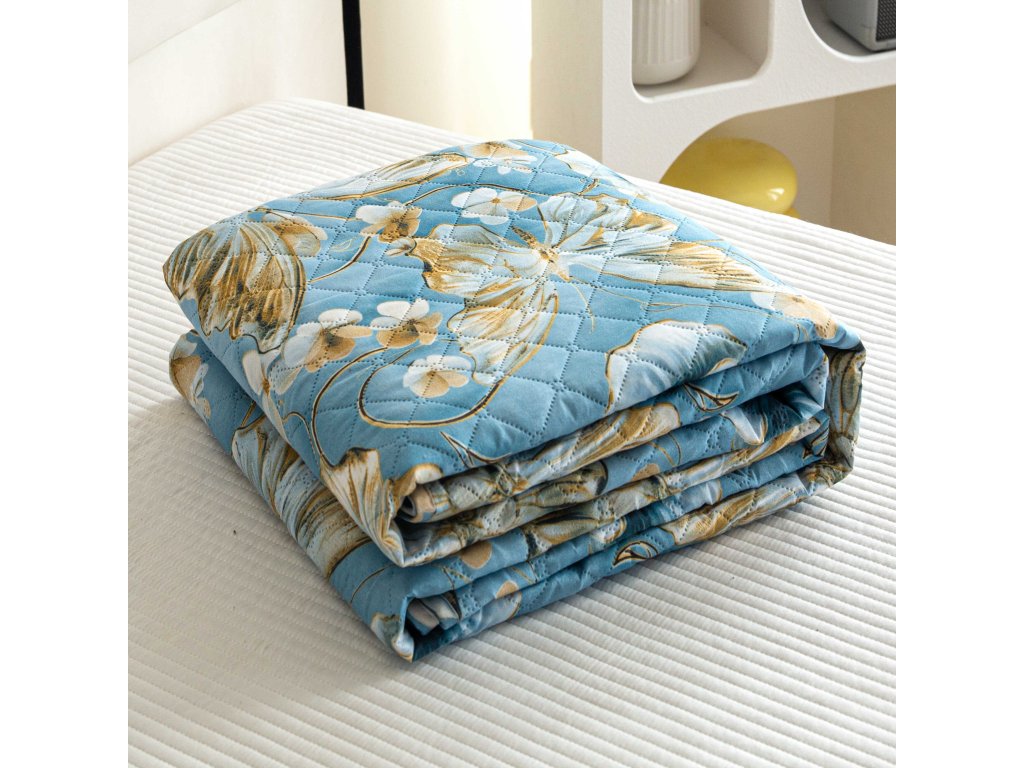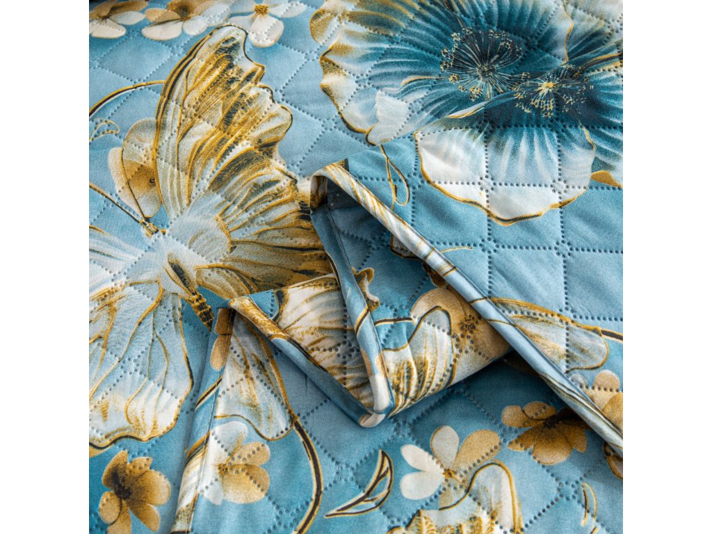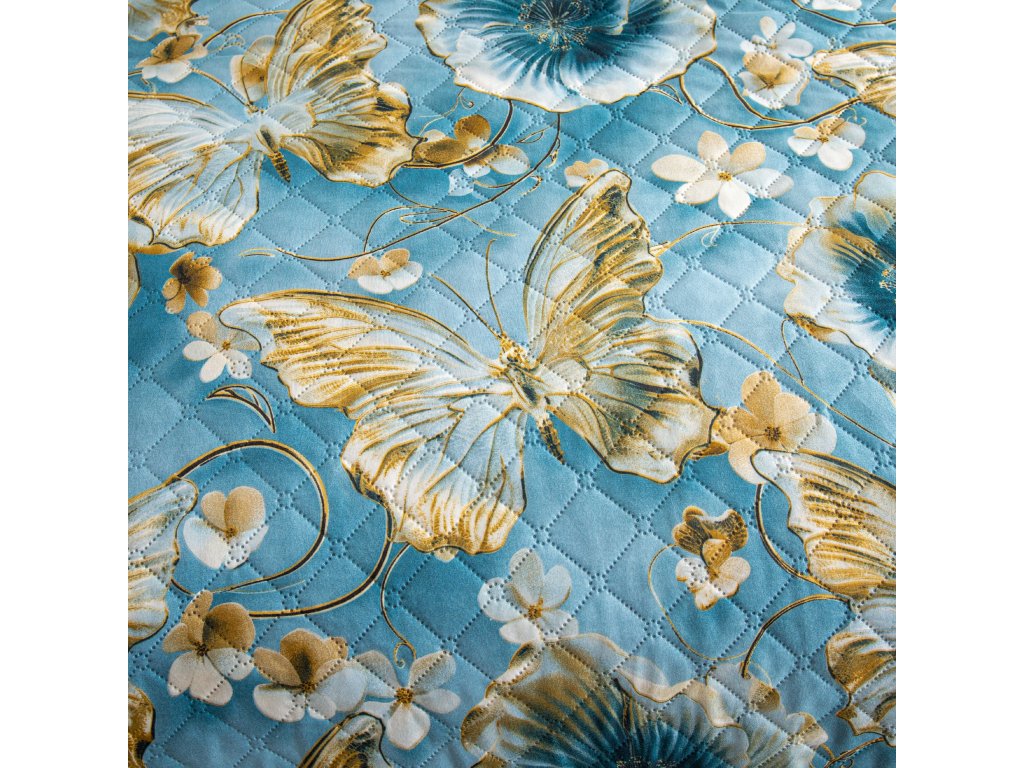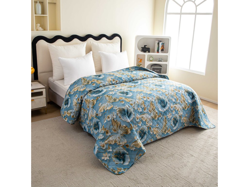 Dopřejte si kouzlo elegance s přehozem CELESTIA v jemné modré barvě. Romantický vzor květin a motýlů v zlatavých tónech dodá vaší ložnici nádech luxusu a klidu.