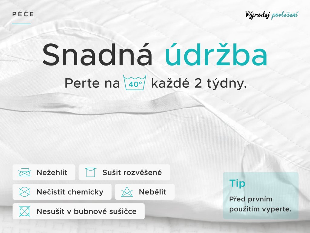 Údržba matracových chráničů je opravdu snadná. Před prvním použitím chránič vyperte a důkladně vysušte. Pro zachování požadovaných vlastností, především nepropustnosti, doporučujeme prát při maximální teplotě 60 °C. Při pravidelné výměně ložního prádla perte i chránič, ideálně 1x za 14 dní. Po usušení nechce chránič volně vysušit, nedoporučujeme používat bubnovou sušičku. V žádném případě ho nevyvářejte, nebělte a nepoužívejte jiné chemické přípravky. Horní vrstvu z mikrovlákna není nutné žehlit. Po vyprání a vysušení je opět dokonale hygienicky čistý a připravený k použití.