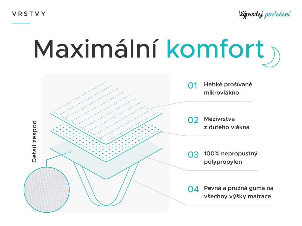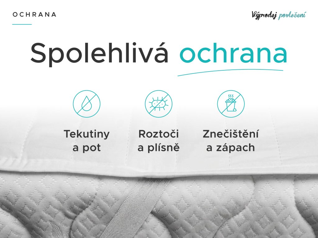 Ochrana matrace je důležitější, než si myslíte. Každý člověk, ať dítě nebo dospělý se přirozeně potí. Během noci vypotíme až litr potu, který se vsákne do prostěradla a jádra matrace. Chránič matrace celkově zvýší hygienu lůžka. Navíc chrání před mechanickým poškozením, znečištěním, roztoči, potem i močí. Jedná se o skvělého pomocníka na dětské postýlky nebo první postele. Své místo má také u dospělých jako běžná ochrana matrace, u seniorů nebo dlouhodobě nemocných, kteří jsou upoutáni na lůžko. Voděodolný chránič vytvoří ochrannou a tekutinám nepropustnou vrstvu. Pocitu spánku na igelitu se bát nemusíte, horní vrstva chrániče je vyrobena z mikrovlákna, které je šetrné k pokožce a příjemné na dotek.