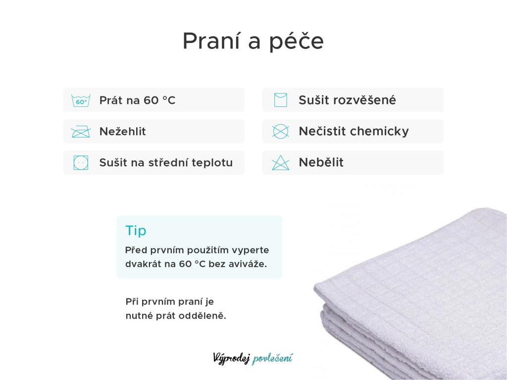 Toužíte po stále jemných a měkkých osuškách?! Nejdůležitější je správná péče. Osušky doporučujeme před prvním použitím vyprat při teplotě 60 °C, poté usušit ve visu nebo v bubnové sušičce na normální, spíše nižší teplotu. Osušky se nesmí čistit chemicky, ani bělit. Žehlení se nedoporučuje z možného poškození smyček, materiál by ztratil savost a svoji jemnost.
