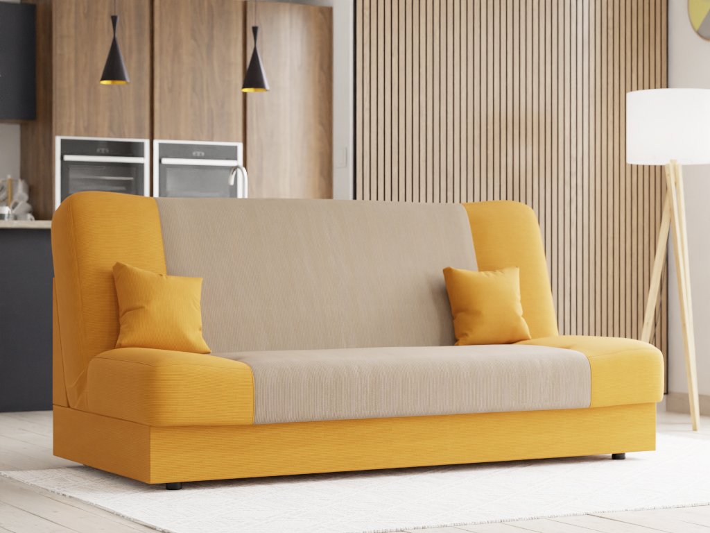 Hořčicová manšestrová rozkládací pohovka RUBY + 2 polštářky zdarma