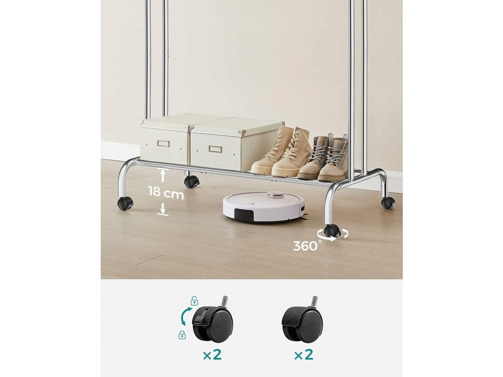 Moderní a mobilní řešení pro organizaci oblečení je klíčem k přehledné a praktické předsíni. Věšáky s kolečky nabízejí jednoduchou manipulaci a umožňují snadné přemístění dle potřeby. Ocelová konstrukce zajišťuje stabilitu a vysokou nosnost, což umožňuje zavěšení většího množství oblečení i těžších kabátů. Díky dodatečným háčkům a spodní polici získáte dostatek prostoru pro doplňky či obuv. Tento věšák je ideální volbou pro ty, kdo chtějí mít svůj prostor nejen dobře organizovaný, ale i stylový a flexibilní.
