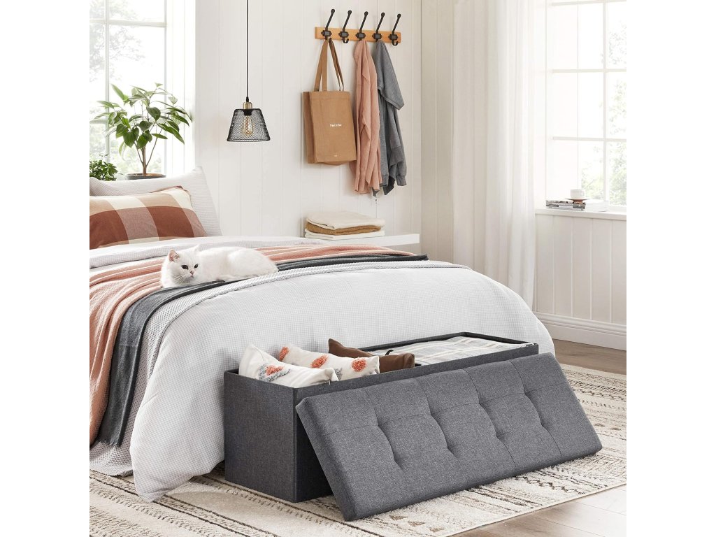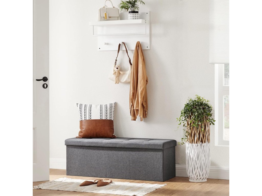 Tato stylová lavice s velkorysým úložným prostorem je skvělým doplňkem do každé místnosti. Díky nosnosti až 300 kg nabízí nejen stabilní sedací plochu, ale také místo pro uložení dek, polštářů nebo sezónních doplňků. Praktická konstrukce umožňuje snadné složení, což oceníte při přenášení nebo ukládání. Jemná, tmavě šedá potahová tkanina dodá vašemu interiéru moderní a elegantní vzhled, zatímco pěnová výplň poskytuje pohodlí. Tato lavice najde své místo jak v obývacím pokoji, tak i v ložnici nebo předsíni, kde pomůže udržet pořádek a zároveň poslouží jako stylový prvek.