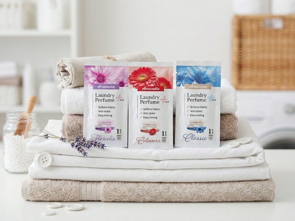 Parfémy na praní AMARELLA v praktickém jednorázovém 10ml sáčku jsou ideálním řešením pro každodenní péči o prádlo i pro použití na cestách či dovolené. Spojují intenzivní vůni s praktickými benefity – dodávají textiliím dlouhotrvající svěžest, jemnost a pohodlí při nošení. Jedna dávka provoní vlákna tak, že oblečení, ručníky i ložní prádlo zůstávají svěží po usušení i během nošení. Navíc působí antistaticky, usnadňují žehlení a pomáhají omezit pomačkání. Jednorázové balení je připraveno k okamžitému použití a poskytuje rychlý způsob, jak mít prádlo krásně voňavé a upravené kdykoli a kdekoli.