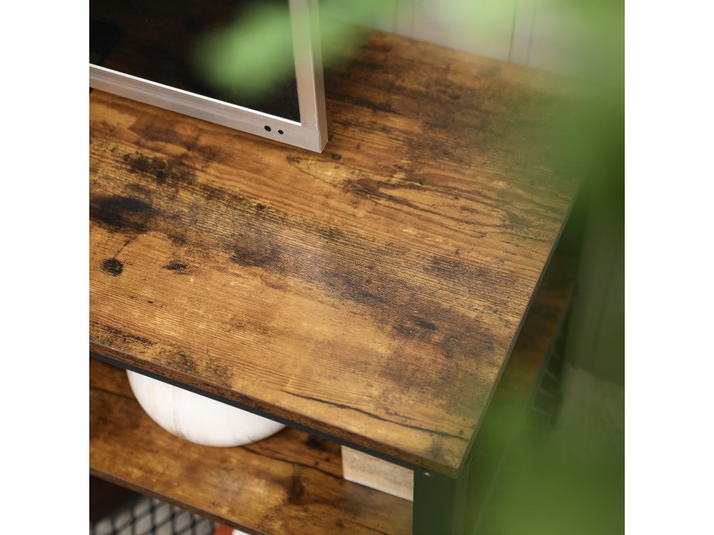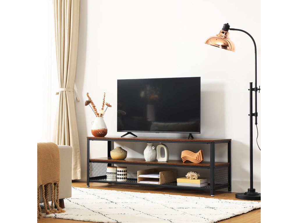 Stylový TV stolek s rustikálním povrchem a industriálními prvky se skvěle hodí nejen pod televizi, ale také jako úložný prostor v obývacím pokoji, předsíni nebo pracovně. Kombinace teplého dřeva a kovu dodává interiéru útulnost i moderní nádech. Jeho prostorné police využijete na dekorace, knihy, elektroniku nebo třeba květiny. Skvělý doplněk, který propojí praktičnost s estetikou.
