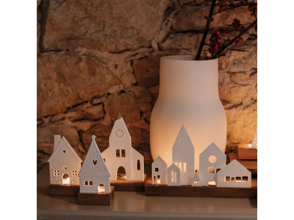 Svícen KOSTEL z porcelánu a akáciového dřeva