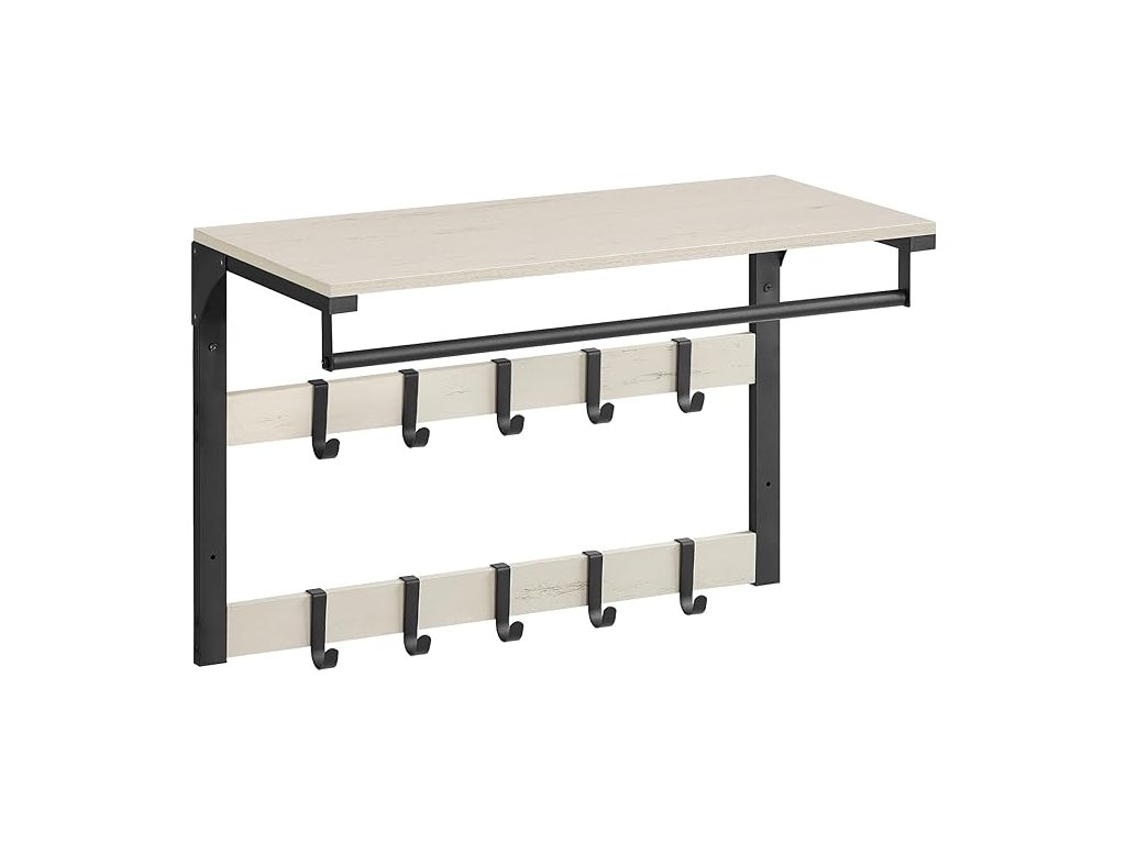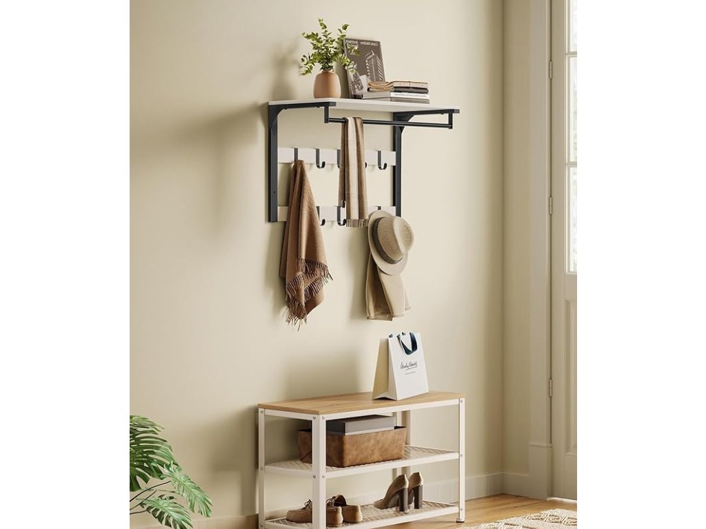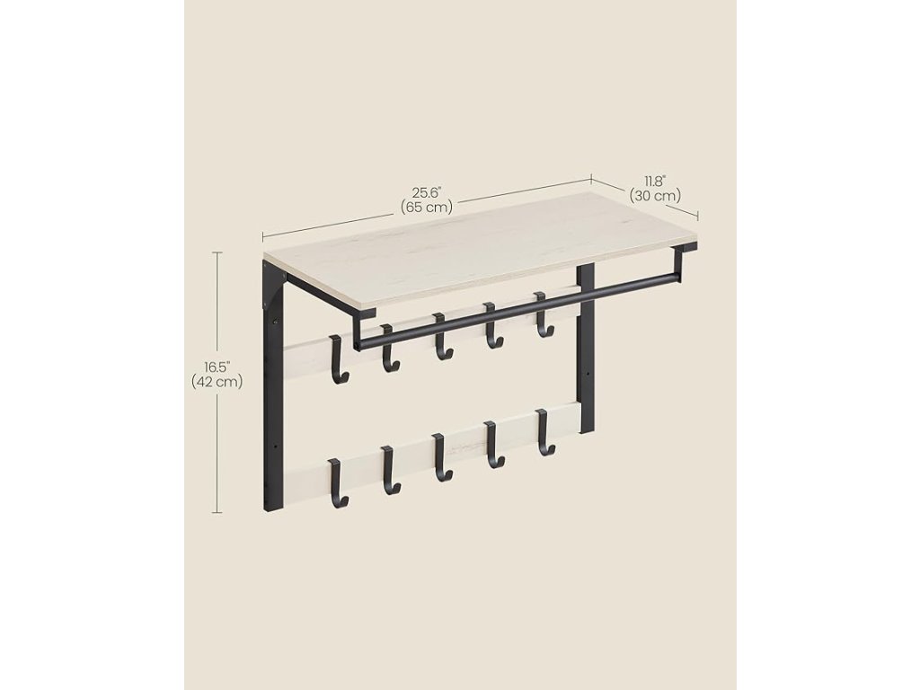 Tato multifunkční police nabízí elegantní spojení designu a praktičnosti. S její pomocí snadno zorganizujete předsíň, ložnici nebo koupelnu, díky kombinaci police, věšáků a závěsné tyče. Police s krémovým dekorem působí přírodně a zároveň moderně, zatímco černá kovová konstrukce dodává stabilitu a styl. Posuvné háčky a závěsná tyč poskytují flexibilní využití podle vašich potřeb, zatímco voděodolná úprava povrchu zajišťuje snadnou údržbu. Ideální volba pro každou domácnost, která ocení funkčnost i estetiku.