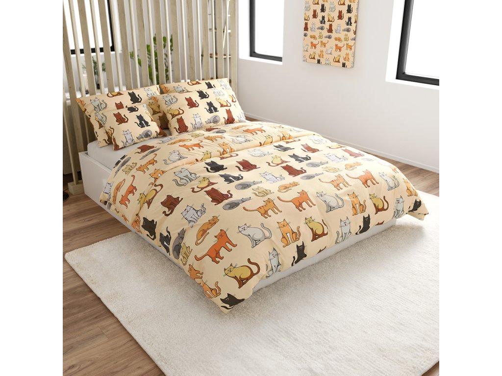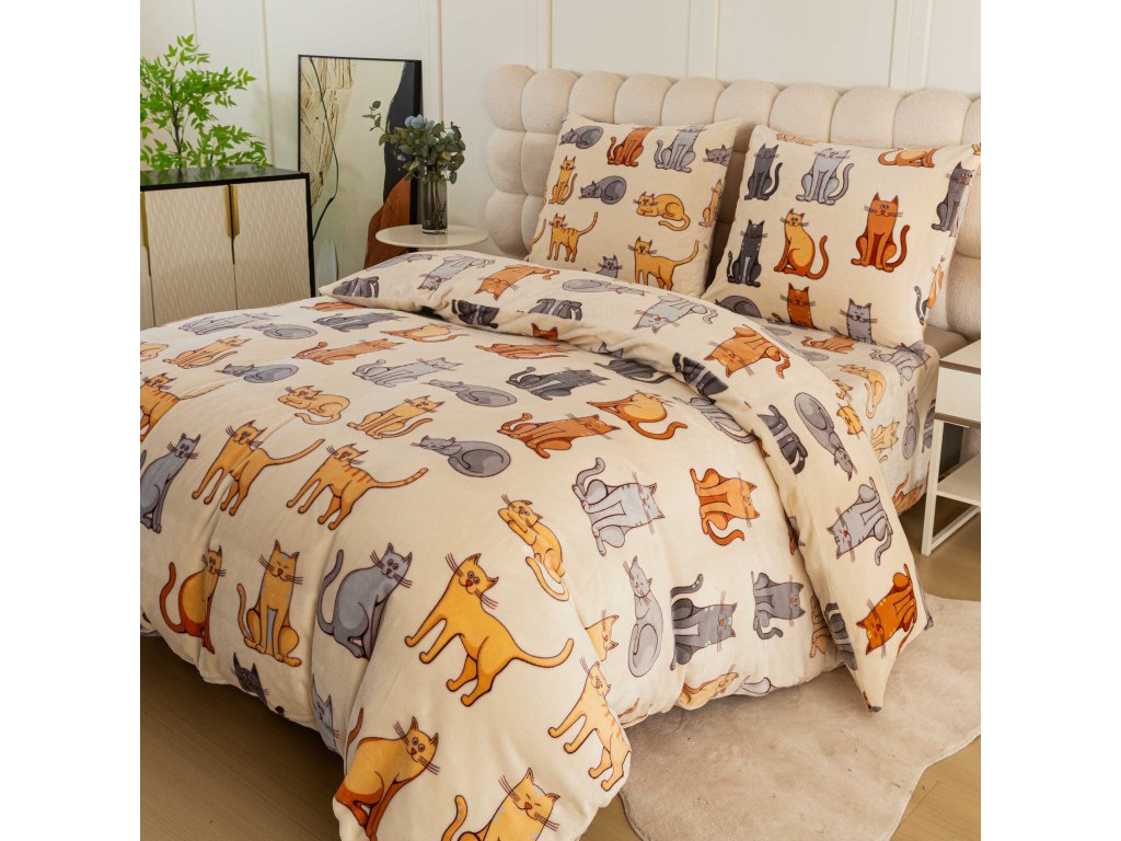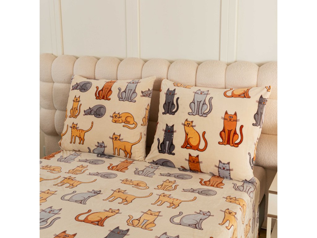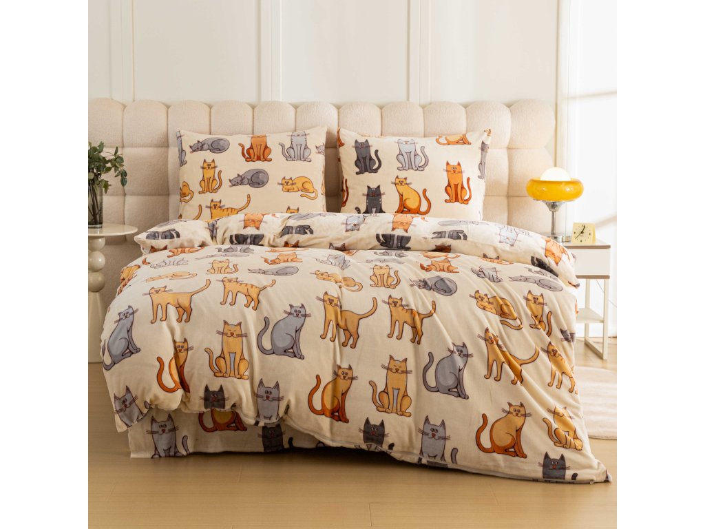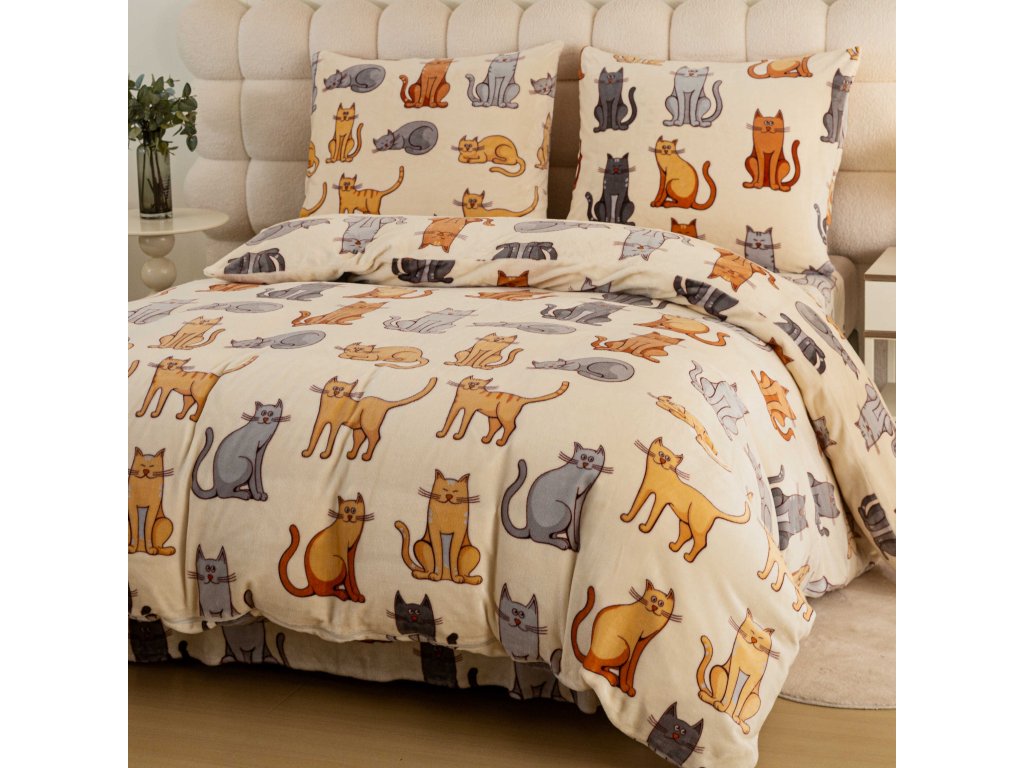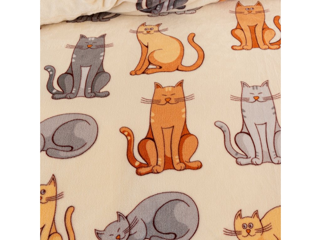 Sada mikroplyšového povlečení COLORED CATS krémové + prostěradlo mikroplyš SOFT 90x200 cm bílé, jednolůžko