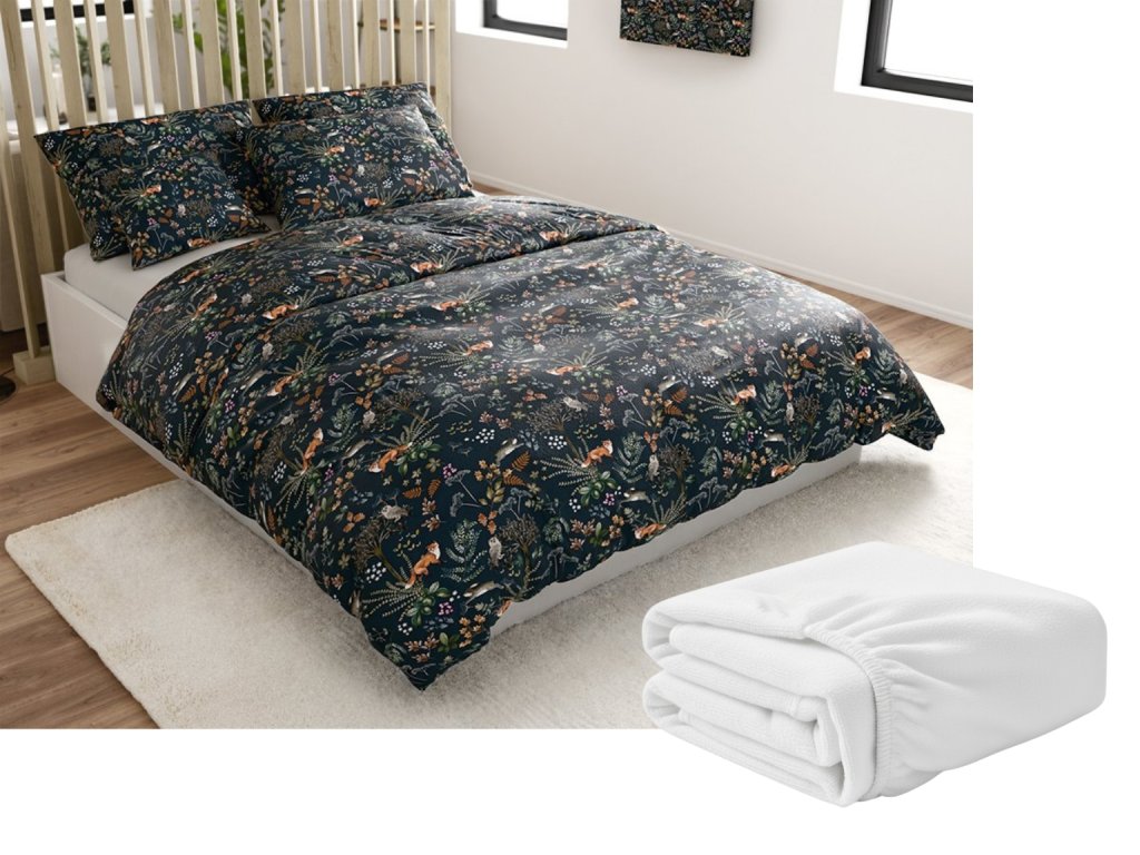 Sada mikroplyšového povlečení LIŠKA A ZAJÍC tmavě zelené + prostěradlo mikroplyš SOFT 90x200 cm bílé, jednolůžko