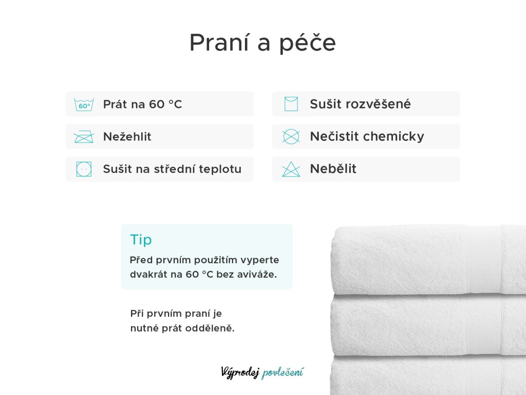Toužíte po stále jemných a měkkých osuškách?! Nejdůležitější je správná péče. Osušky doporučujeme před prvním použitím vyprat při teplotě 60 °C, poté usušit ve visu nebo v bubnové sušičce na normální, spíše nižší teplotu. Osušky se nesmí čistit chemicky, ani bělit. Žehlení se nedoporučuje z možného poškození smyček, materiál by ztratil savost a svoji jemnost.