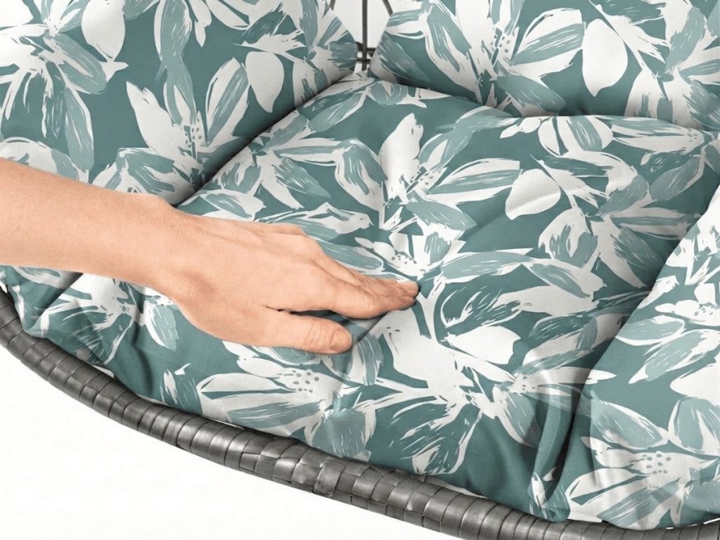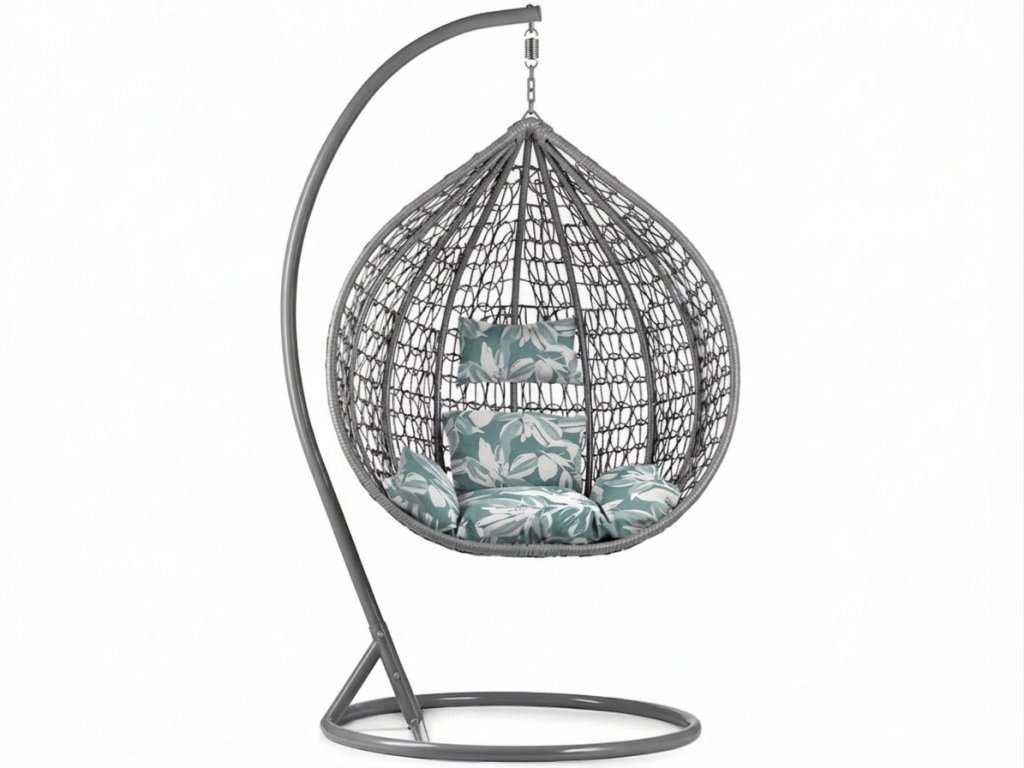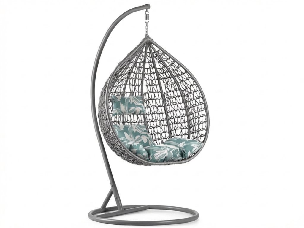 Šedé závěsné křeslo KOKON se stojanem, zeleno-bílý polštář